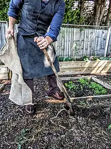 Hand potato planters, often referred to as foot-operated planters, are long-handled tools attached to a hinged "beak". The tuber is placed into the planter-beak and penetrated into the ground by means of stepping on the planter base with the foot. The handle is then angled, thus opening the base and allowing the tubing to be planted into the soil.[2][3]