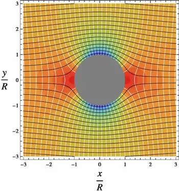 In mathematics, potential flow around a circular cylinder is a classical solution for the flow of an inviscid, incompressible fluid around a cylinder that is transverse to the flow. Far from the cylinder, the flow is unidirectional and uniform. The flow has no vorticity and thus the velocity field is irrotational and can be modeled as a potential flow. Unlike a real fluid, this solution indicates a net zero drag on the body, a result known as d'Alembert's paradox.