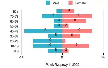 According to the 2002 Poland census, there were 110 people residing in Potok Rządowy village, of whom 52.7% were male and 47.3% were female. In the village, the population was spread out, with 20% under the age of 18, 32.7% from 18 to 44, 18.2% from 45 to 64, and 29.1% who were 65 years of age or older.[1]
