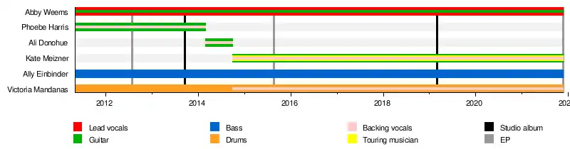 Potty Mouth was an American pop rock band, formed in Western Massachusetts, in 2011 at Smith College. The band's original lineup was Ally Einbinder (bass), Phoebe Harris (lead guitar, vocals), Abby Weems (lead vocals, rhythm guitar), and Victoria Mandanas (drums). Following Harris' (and later Ali Donohue's) departure, Potty Mouth continued as a three-piece, with Abby Weems on lead guitar.