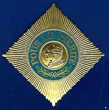 The Pour le Mérite was founded in 1740 by King Frederick II of Prussia.[8] It was named in French, which was the leading international language and the favoured language at Frederick's court.[9] The French name was retained, despite the rising tide of nationalism and increasing hostility between French and Germans during the 19th century, and indeed many of its recipients were honoured for acts performed in wars against France. The insignia of the military award was a blue-enameled Maltese Cross with golden eagles between the arms (which is based on the symbol of the Johanniter Order) and the Prussian royal cypher and the words Pour le Mérite ("For Merit" in French) written in gold letters on the body of the cross. The ribbon was black with edge stripes of silver-white. The order consisted of only one class, both civil and military, until 1810.[10] Only a few civilians were honored: Pierre Louis Maupertuis (1747),[11] Francesco Algarotti (1747)[12] and Voltaire (1750).[13][14][15]