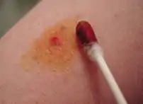 ![]() Povidone-iodine applied to an abrasion using a cotton swab. | |