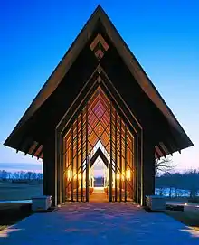 The iconic Marjorie Powell Allen Chapel is a 4,700 sq. ft. nondenominational wedding chapel that first opened in 1996. It was designed by architect E. Fay Jones and is made of mostly wood and glass.[1]