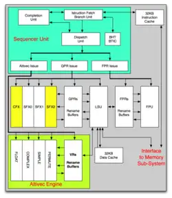 The e600 is a superscalar out-of-order RISC core with 32/32 kB L1 data/instruction caches, a seven-stage, three-issue pipeline with load/store, system register, powerful branch prediction, integer unit, a double precision FPU and an enhanced 128-bit AltiVec unit with limited out-of-order execution. The core is designed to work in multiprocessing and multi core designs and can take large amounts of L2 caches on die.