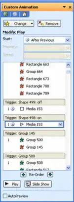 Animation Trigger is another feature introduced in Microsoft PowerPoint 2002/XP and the later versions (but, only supported on Macintosh since 2019, in Office 365[1]). This feature allows animators to apply effects that can be triggered when a specific object on the Slide Show is clicked. This feature is the basis for the majority of PowerPoint games, which usually involve clicking object.