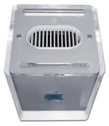 The Power Mac G4 Cube is a small cubic computer, suspended in a 7.7×7.7×9.8 in (20×20×25 cm) acrylic glass enclosure. The designers intended the transparent plastic to give the impression that the computer is floating.[2] The enclosure houses the computer's vital functions, including a slot-loading optical disc drive. The Cube requires a separate monitor with either an Apple Display Connector (ADC) or a Video Graphics Array (VGA) connection.[3] The machine has no fan to move air and heat through the case. Instead, it is passively cooled, with heat dissipated via a grille at the top of the case.[4] The base model shipped with a 450 MHz PowerPC G4 processor, 64 MB of random-access memory (RAM), 20 GB hard drive, and an ATI Rage 128 Pro video card.[3] A higher-end model with a 500 MHz processor, double the RAM, and a 30 GB hard drive was available only through Apple's online store.[5]