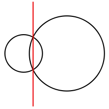 In the case n = 2, the power diagram consists of two halfplanes, separated by a line called the radical axis or chordale of the two circles. Along the radical axis, both circles have equal power. More generally, in any power diagram, each cell Ri is a convex polygon, the intersection of the halfspaces bounded by the radical axes of circle Ci with each other circle. Triples of cells meet at vertices of the diagram, which are the radical centers of the three circles whose cells meet at the vertex.[2][3][4]