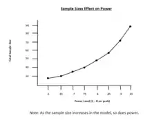 The sample size determines the amount of sampling error inherent in a test result. Other things being equal, effects are harder to detect in smaller samples. Increasing sample size is often the easiest way to boost the statistical power of a test. How increased sample size translates to higher power is a measure of the efficiency of the test — for example, the sample size required for a given power.[4]