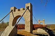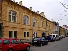 "In 1940, on the eve of the Holocaust, Prešov contained five synagogues and more than one in six of the city's population—4,308 people—was Jewish. Three of the synagogues are still standing, but the Jewish community now numbers fewer than 60. Outside the sole functioning synagogue, on Švermova just off the main square, is a memorial to the 6,400 Jews from Prešov and the surrounding region who died in the Holocaust. The broad path leading to the tombstone-shaped monument, surrounded by prison-like bars, is intended to represent the Jewish pre-war population; the narrow path that leads on from it to the synagogue, those who survived."[13]