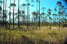 In the southeast, longleaf pine dominated the savanna and open-floored forests which once covered 92,000,000 acres (370,000 km2) from Virginia to Texas. These covered 36% of the region's land and 52% of the upland areas. Of this, less than 1% of the unaltered forest still stands.[9]