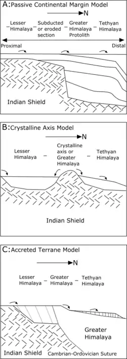 This model posits that the Lesser and Tethyan Himalaya were deposited in distinct basins that are separated by the Greater Himalaya complex.[27]