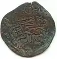 A coin of Rajadhiraja Chola II with a lion surmounted by a sword