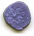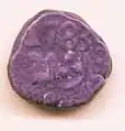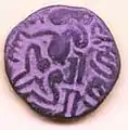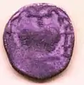 The goddess Lakshmi coins are either cast or struck.[2] The two coins illustrated below are cast. They are found in may sizes ranging from about 3 inches to half an inch. The obverse of these coins bear the image of the goddess holding lotus stalks, surmounted by two elephants pouring water. Initially these were thought to be votive offerings. but now scholars are unanimous that they were indeed coins.[1] They are early coins of the Chera Dynasty from about 500 BCE found in Kandarodai.