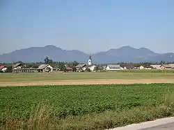 The local church, a chapel-of-ease of the Parish of Šenčur, is dedicated to the Exaltation of the Holy Cross.[3] The current building dates to 1855, but was built on the site of an earlier church.[4]
