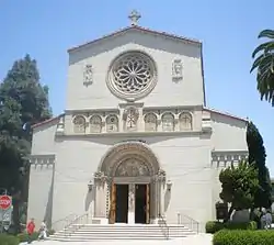 The current church building stands on a v-shaped corner of Occidental Blvd. and Hoover St., dedicated in November 1926. It is an Italian Romanesque structure. The church has three rose windows that offer a dim and religious life. Twelve large stained glass windows, six yellow windows and the Stations of the Cross Mosaics are over the nave.[1] The church structure is entirely made of poured concrete. The ceiling beams are painted to look like wood however is concrete. The church was remodelled in 1951 by Wallace Neff who commissioned Millard Sheets to create the mosaics in the apse. Neff also added a parish hall.[5]