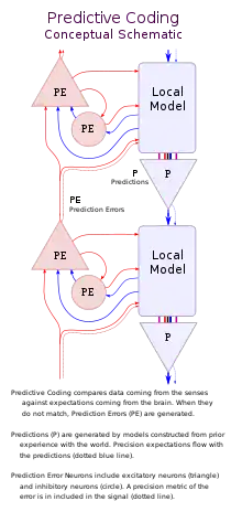 In neuroscience, predictive coding (also known as predictive processing) is a theory of brain function in which the brain is constantly generating and updating a mental model of the environment. The model is used to generate predictions of sensory input that are compared to actual sensory input. This comparison results in prediction errors that are then used to update and revise the mental model.[1]