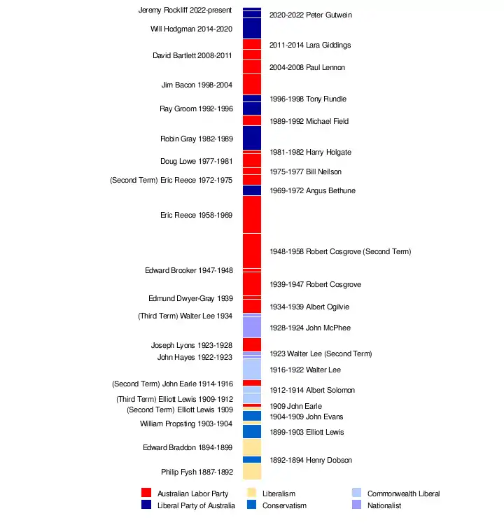 Before the 1890s, there was no formal party system in Tasmania. Party labels before that time indicate a general tendency only. The current convention of appointing the premier from the House of Assembly was not generally applied prior to 1920, with premiers often appointed from the Legislative Council.[1]
