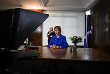 Sturgeon's leadership as SNP leader was first tested by the 2015 UK general election, to which she led her party to a historic landslide victory. The SNP won all, but three, of the fifty-nine seats in Scotland, the best result of the SNP since the 1974 general election.[1] She then led her party through the 2016 Scottish Parliament election.[2] Although the SNP lost their overall majority, Sturgeon still secured her position as first minister through as minority government. The following month a referendum on the UK's membership in the EU was put to the people. The result concluded with England and Wales voting a majority to leave, with Scotland and Northern Ireland voting overwhelmingly to remain.[3] She commented, stating is was "democratically unacceptable" that Scotland could be taken out of the EU "against its will".[4] Sturgeon, ever since, has been pushing for a second independence referendum. In the 2017 UK general election, the SNP saw a fall in seats but in the 2019 election, regained many winning 48 seats.[5][6] Sturgeon led the SNP to a fourth consecutive win, securing a third term in the Scottish Parliament, in the 2021 election.