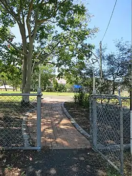 The immediate post-World War II years were a time for improvements. Estimates for the erection of a tennis court of £40-50 were received in 1946, but it was not until a working bee in April 1951 that the tennis court was completed.[35] Meanwhile, on 31 July 1948, an honour board with the names of those from the district who served in WWII was unveiled. Constructed by Frank Olkers of Lowood, the honour board was erected by the School Committee and funded by Prenzlau Progress Association.[36] A report of the unveiling event stated that all those listed on the board were past scholars of the Prenzlau School. In 1949 the exterior of the school was painted.[37] Electricity was connected to the school in September 1952.[38] The roof was replaced after cyclonic winds unroofed the school in June 1954; and the northern portion of the east verandah was enclosed to house a library in 1959.[39] In this year also, a new teacher's residence was built (removed post-2005) and the old residence demolished.[40] In 1962 at a cost of £40, alterations to the school included resurfacing of the tennis court.[41][1]