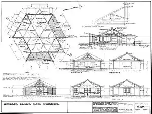 Kevin Borland Hall (1962) The first building Kevin Borland designed for the school was the 'Preshil school hall', later renamed to 'Kevin Borland Hall', constructed in 1962. It was designed for multi-purpose use and with its octagonal shape it was a clear departure from the usual nave-like school halls. It is most famous for its intricate octagonal timber roof structure with skylights. It has wooden beams that span both the hall and the sheltered bays outside of it. The roof is clad in steel deck, and the walls are built of grey concrete blocks.[5] In 1959 Kevin Borland and Geoff Trewenack designed glazed pyramidal skylights in the McCarthy-house that acted as a precedent of the roof structure at the Preshil school hall.[6]
