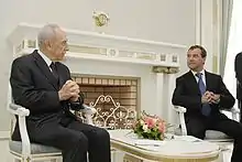 In January 2009, at the World Economic Forum in Davos, Switzerland, Peres was involved in an angry exchange with Turkish Prime Minister Recep Tayyip Erdoğan.[10] The two were part of a panel discussion that also featured the secretary general of the Arab League, Amr Moussa, and the UN Secretary-General Ban Ki-Moon, when Erdoğan became angry after moderator David Ignatius of the Washington Post refused to allow him to rebut the Israeli president's comments about the 2008–2009 Israel–Gaza conflict. Resisting attempts to end the session, Erdoğan told Peres "When it comes to killing, you know well how to kill", then stormed off-stage, vowing never to return to Davos.[11] The Turkish Anadolu Agency later reported that Peres phoned Erdoğan a few minutes later, apologizing for any misunderstanding.[11] At home and throughout the Middle East, Erdoğan was feted afterwards as a hero.[12][13][14][15]