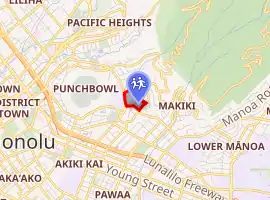 Roosevelt High School is located in urban Honolulu, Hawaiʻi. It is situated in Makiki's Kalāwahine Valley adjacent to the National Memorial Cemetery of the Pacific overlooking downtown Honolulu and Ala Moana.