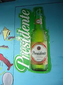 Presidente is a brand of Pilsner beer that is owned and produced by Cervecería Nacional Dominicana (CND) at several breweries in the Dominican Republic.[1] In addition to domestic consumption in the Dominican Republic, Presidente is exported to the United States, Panama, Honduras, Spain, Germany, Switzerland, Italy, Andorra, Aruba, Cuba, Curaçao, Antigua, Belize, Martinique, Guadeloupe, Turks and Caicos, The Bahamas, Saint Martin, British Virgin Islands and Puerto Rico.[2] Varieties include Presidente (5.0% ABV) and Presidente Light (4.3 ABV.)[3]