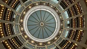 The Cihannuma (World Atlas) Hall, decorated with 16 columns representing the 16 Great Turkic Empires, houses a collection of 200,000 books and has a seating capacity for 224 readers at a time in an area of 3,500 square meters.[2] The dome of the Cihannuma Hall is 32 meters high and 27 meters wide.[5]