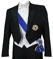 A special and rarely granted award, called the Presidential Medal of Freedom with Distinction,[8] has a larger version of the same badge, which is worn as a star on the left chest. It comes with a sash that is worn over the right shoulder (similarly to the Grand Cross of an order of chivalry), with its rosette (blue with a white edge, bearing the central disc of the badge at its center) resting on the left hip. When the medal with Distinction is awarded, the star may be presented hanging from a neck ribbon and can be identified by its size, which is larger than the standard badge.