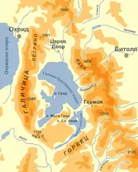 The toponym Prespa is used for a lake, an island settlement or simply an island.[1] The exact borders and character of the town are difficult to define by the historical sources. It has been searched in the valley of the Lake Prespa, surrounded by the mountains Baba, Petrino, Galičica, Zvezda and Korbets. It is situated in the territories of three modern countries: Albania, North Macedonia and Greece. According to the archaeological research, in the Early Middle Ages there were construction activities in the following sites: