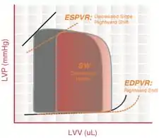During heart failure, myocardial contractility is reduced, which decreases the slope of the PRSW relationship. Recent studies also indicate that the volume axis intercept of the PRSW relationship (not the slope) may be a better indicator of the severity of contractile dysfunction.