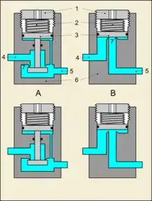 Both types of regulator use feedback of the regulated pressure as input to the control mechanism, and are commonly actuated by a spring loaded diaphragm or piston reacting to changes in the feedback pressure to control the valve opening, and in both cases the valve should be opened only enough to maintain the set regulated pressure. The actual mechanism may be very similar in all respects except the placing of the feedback pressure tap.[2] As in other feedback control mechanisms, the level of damping is important to achieve a balance between fast response to a change in the measured pressure, and stability of output. Insufficient damping may lead to hunting oscillation of the controlled pressure, while excessive friction of moving parts may cause hysteresis.