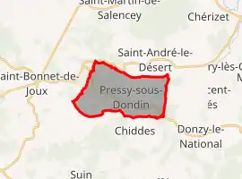 Pressy-sous-Dondin is a commune in the Saône-et-Loire department in the region of Bourgogne-Franche-Comté in eastern France.