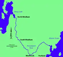 The Presumpscot River (/prɪˈzʌmpskət/)[2] is a 25.8-mile-long (41.5 km)[3] river located in Cumberland County, Maine. It is the main outlet of Sebago Lake. The river provided an early transportation corridor with reliable water power for industrial development of the city of Westbrook and the village of South Windham.[4]