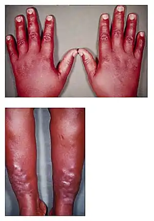 | Hands showing related condition thyroid acropachy and shins of someone with pretibial myxedema | |