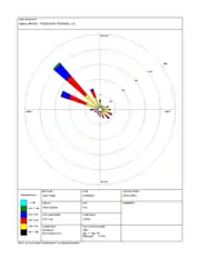 A wind rose is a graphic tool used by meteorologists to give a succinct view of how wind speed and direction are typically distributed at a particular location. Presented in a polar coordinate grid, the wind rose shows the frequency of winds blowing from particular directions. The length of each spoke around the circle is related to the proportion of the time that the wind blows from each direction. Each concentric circle represents a different proportion, increasing outwards from zero at the center. A wind rose plot may contain additional information, in that each spoke is broken down into color-coded bands that show wind direction ranges. Wind roses typically show 8 or 16 cardinal directions, such as north (N), NNE, NE, etc.,[2] although they may be subdivided into as many as 32 directions.[3]