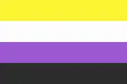 The non-binary pride flag was created in 2014 by activist Kye Rowan.[36] Each stripe color represents different types of non-binary identities: Yellow for people who identify outside of the gender binary, white for nonbinary people with multiple genders, purple for those with a mixture of both male and female genders, and black for agender individuals.[37]