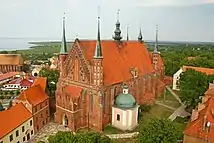 The Prince-Bishopric of Warmia[3] (Polish: Biskupie Księstwo Warmińskie;[4] German: Fürstbistum Ermland)[5] was a semi-independent ecclesiastical state, ruled by the incumbent ordinary of the Warmia see and comprising one third of the then diocesan area. The Warmia see was a Prussian diocese under the jurisdiction of the Archbishopric of Riga that was a protectorate of the Monastic state of the Teutonic Knights (1243–1464) and a protectorate and part of the Kingdom of Poland—later part of the Polish–Lithuanian Commonwealth (1464–1772), confirmed by the Peace of Thorn in 1466.[6] The other two thirds of the diocese were under the secular rule of the Teutonic Knights until 1525 and Ducal Prussia thereafter, both entities also being a protectorate and part of Poland from 1466.[7]