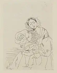 The Royal Collection holds six volumes of etchings by the Queen and the Prince Consort, plus further copies.[5] In all sixty-two plates were made by the Queen, and twenty-five by the Prince. An almost complete set of the prints was given to the British Museum by King George V in 1926.[6][7] There is also a volume with 74 of the etchings in the collections of Harewood House. This volume had been owned by Prince Albert's private secretary George Anson, and was given by a descendant of his to Princess Mary on the occasion of her marriage to the 6th Earl of Harewood in 1922.[8] A volume of 80 etchings that the Queen presented to Prince Albert's biographer Sir Theodore Martin in 1869 came up for auction in Cirencester in 2016, but failed to make a reserve price of £24,000.[9]