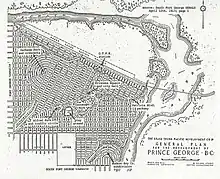 Properties were sold in both of the townsites with railway speculation driving up prices.[9] By 1913, South Fort George and Fort George each had a population of around 1,500 and were booming as thousands of rail construction workers came to town for supplies and entertainment.[13] Both communities believed that the Grand Trunk Pacific station would be built in their town, and both were disappointed when the railway purchased the 553 ha (1,366 acres) of land in between them from the Lhiedli T'enneh instead, even though Charles Vance Millar, then the owner of the BC Express Company, was well into negotiations to purchase that property himself.[14][8] The railway compensated Millar by giving him 81 ha (200 acres) of the property and, by 1914, when the railway was completed and the first train arrived, there were four major communities in the area: South Fort George, Fort George Townsite, the Millar Addition and the railway's townsite, Prince George, where the station was built.[8] Hammond also developed his lots further, including additions such as Central Fort George. Although George Hammond fought a series of bitter legal battles for a railway station in Fort George. The Railway argued against a station in Fort George as it was their investment and risk, thus they would build a station in a townsite of their own (Prince George).[9] Plans for the townsite for Prince George were created by Brett and Hall of Boston, and the land cleared in May 1913.[6]