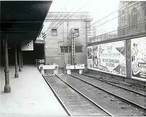 By 1910, the two stations were effectively joined together, although they retained their separate names. There were three platforms at Princes Bridge. One was an extension of Flinders Street platform 1 ("platform 1 East"), while the other two served an island platform, with the tracks being numbered 15 and 16. Track 15 was a dead end, but track 16 (the northernmost one) had a traverser between it and a parallel run around siding, which allowed steam locomotives to change ends. A footbridge provided pedestrian access to the east end of the island platform from Flinders Street, with the 'Flinders Street D' signal box located beyond it. Further north-east of the main lines to Jolimont was a locomotive siding and a coal stage, and a carriage siding was located to the south-east.[4] By 1957, the sidings had been rationalised, with the locomotive facilities and traverser removed.[5] The sidings now formed part of Jolimont Yard.