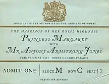 Margaret married Armstrong-Jones at Westminster Abbey on 6 May 1960.[115] The ceremony was the first royal wedding to be broadcast on television,[57] and it attracted viewing figures of 300 million worldwide.[116] 2,000 guests were invited for the wedding ceremony.[109] Margaret's wedding dress was designed by Norman Hartnell and worn with the Poltimore tiara.[32] She had eight young bridesmaids, led by her niece, Princess Anne.[117] The Duke of Edinburgh escorted the bride, and the best man was Dr Roger Gilliatt.[109] The Archbishop of Canterbury Geoffrey Fisher conducted the marriage service.[109] Following the ceremony, the couple made the traditional appearance on the balcony of Buckingham Palace.[109] The honeymoon was a six-week Caribbean cruise aboard the royal yacht Britannia.[118] As a wedding present, Colin Tennant gave her a plot of land on his private Caribbean island, Mustique.[119] The newlyweds moved into rooms in Kensington Palace.[120]