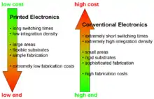 The most important benefit of printing is low-cost volume fabrication. The lower cost enables use in more applications.[5] An example is RFID-systems, which enable contactless identification in trade and transport. In some domains, such as light-emitting diodes printing does not impact performance.[3] Printing on flexible substrates allows electronics to be placed on curved surfaces, for example: printing solar cells on vehicle roofs. More typically, conventional semiconductors justify their much higher costs by providing much higher performance.