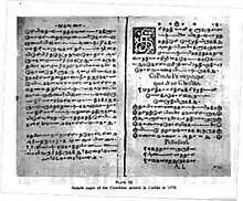 In 1577 the first of the Henriques’ five books, Doctrina Christam en Lingua Malauar Tamul (Thambiran Vanakkam) was printed in Goa. The book was the first book printed with Indian type. Although some scholars refuse to consider this as a historical fact, Graham Shaw seems convinced that it was printed. The second printed Tamil book was only 16 pages long, but a third Catechism of 127 pages, a Tamil translation of the popular Portuguese text by Marcos Jorge, was printed again with new type in Cochin on November 14, 1579. Three Catechisms were printed with three sets of type, at three different locations on the west coast over the following three years. Henriques’ two other books printed at Cochin were: