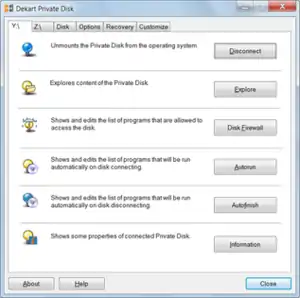 Private Disk is a disk encryption application for the Microsoft Windows operating system, developed by Dekart SRL. It works by creating a virtual drive, the contents of which is encrypted on-the-fly; other software can use the drive as if it were a usual one.
