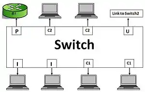 - Promiscuous port (P-Port): The switch port connects to a router, firewall or other common gateway device. This port can communicate with anything else connected to the primary or any secondary VLAN. In other words, it is a type of a port that is allowed to send and receive frames from any other port on the VLAN.