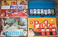 Probe is a parlor game or board game introduced in the 1960s by Parker Brothers. It is reminiscent of the simple two-person game Hangman, whose object is to guess a word chosen by another player by revealing specific letters. Probe extends the number of players to a maximum of four and introduces additional game elements that increase the levels of both skill and chance. Like Hangman, each player has a secret chosen word. But unlike Hangman, the game ends when the last word, not the first word, is revealed. All players remain in the game until the end.[1] It was created by Ted Leavitt and licensed by him to Parker Brothers.[2]