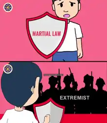 On May 31, 2017, the Presidential Communications Operations Office (PCOO) released a cartoon video with the hashtag #DefendRepublic promoting Martial Law on the Internet via its official Twitter and Facebook accounts.[58][59] In it, a fearful boy is seen holding a shield with the words "Martial Law" inscribed on it, as silhouettes of professional-looking soldiers labeled "Extremist" march upon him, while a voiceover narrates:[60]