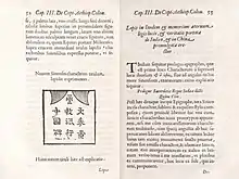 The presses of the Propaganda Fide already had typesets for Greek, Arabic, Hebrew, and Ethiopian at the time Prodromus was published,[3] but there was no typeset for Chinese characters.[7]: 33 A new typeset for the Coptic alphabet had to be created specially in order to print the work,[8]: 14 which has been described as “a tour de force of seventeenth-century typography.”[4]: 4