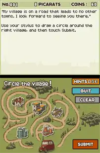 Puzzles include brain teasers, sliding puzzles, logic puzzles, and others. The player is presented with each puzzle and its value in "picarats", and is given an unlimited amount of time to solve it. Each puzzle has three hints available for it, but the player must spend one "hint coin" to see each hint. Hint coins are limited; the player starts with ten, and more can be found by examining suspicious objects around the village. Once the player feels they have the answer to a puzzle, depending on the puzzle, they might enter it by selecting an answer, drawing a circle around a specific area, or entering the answer by inputting letters or numbers into the DS's touchscreen. If the player is correct, the picarats are added to his total score, and he is sometimes rewarded with an item. If the player is incorrect, he can retry the puzzle indefinitely, though the first two times he is wrong, the value of the puzzle will decrease by approximately ten percent each time (or more, in the case of multiple-choice puzzles). There are also puzzles in which the player must make a sequence of moves in order to reach some final state, and cannot submit an incorrect answer. Optionally, a player can quit a puzzle at no cost and try another, though certain puzzles are mandatory to progress. Once a puzzle is completed, the player may retry it at any time via the game's menu.